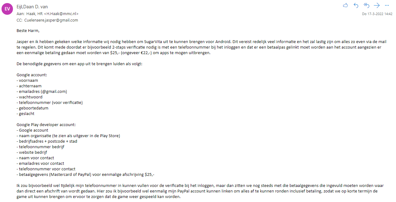 To be able to release on the Android appstore, I needed a Google Developer Account. To create this account, I advised the client to create an account and provided the client with the research I had done. This was done by another intern who wrote an e-mail with the information he collected on releasing for IOS and my information about releasing on Android. The credits to this image go to Daan van Eijl at his portfolio.